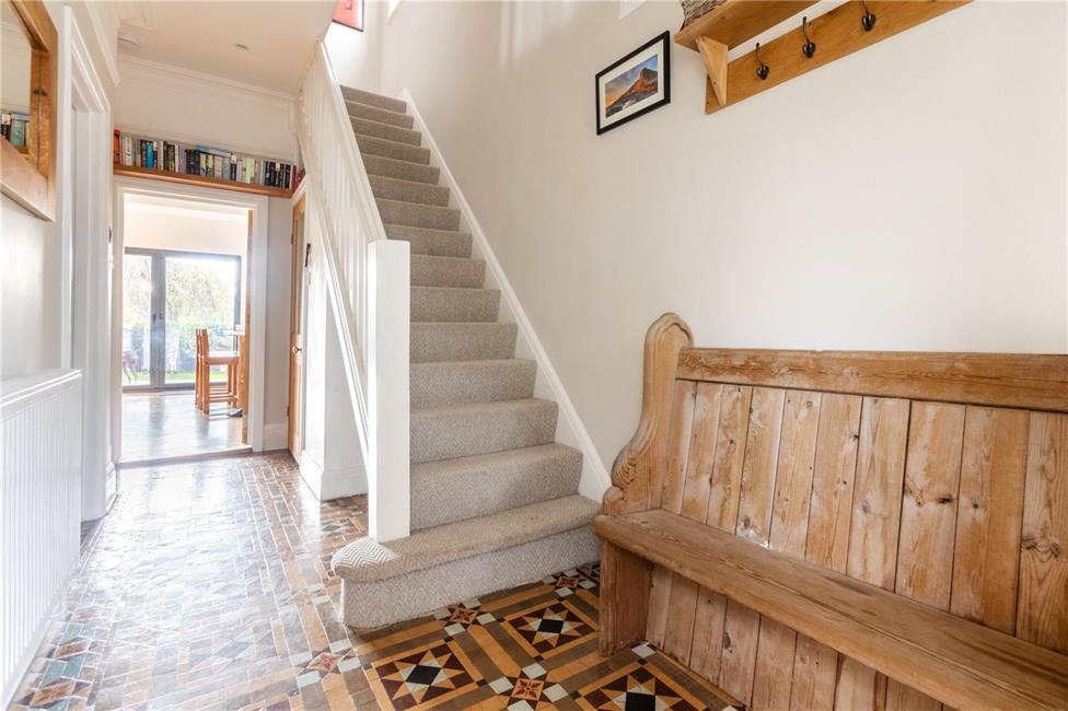 Period, window into the porch, easy rising spindle staircase to first floor landing, under stairs recess, period features include the coved ceiling, picture rail, high level skirting boards, and radiator.