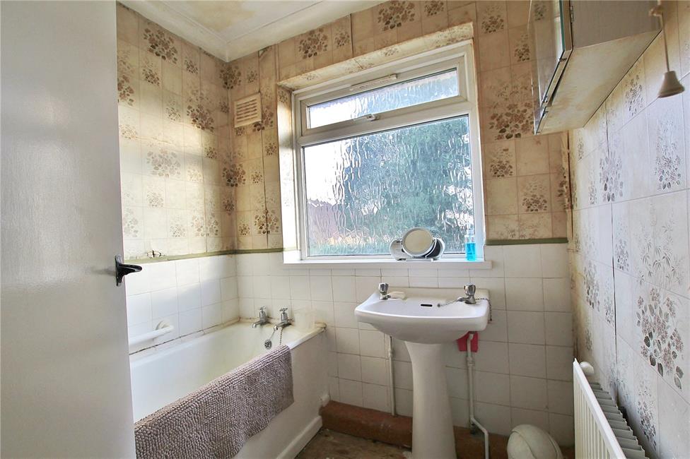 Opaque window to the rear, steel panelled bath with tiling to half height, pedestal wash hand basin, radiator, exposed floorboards.