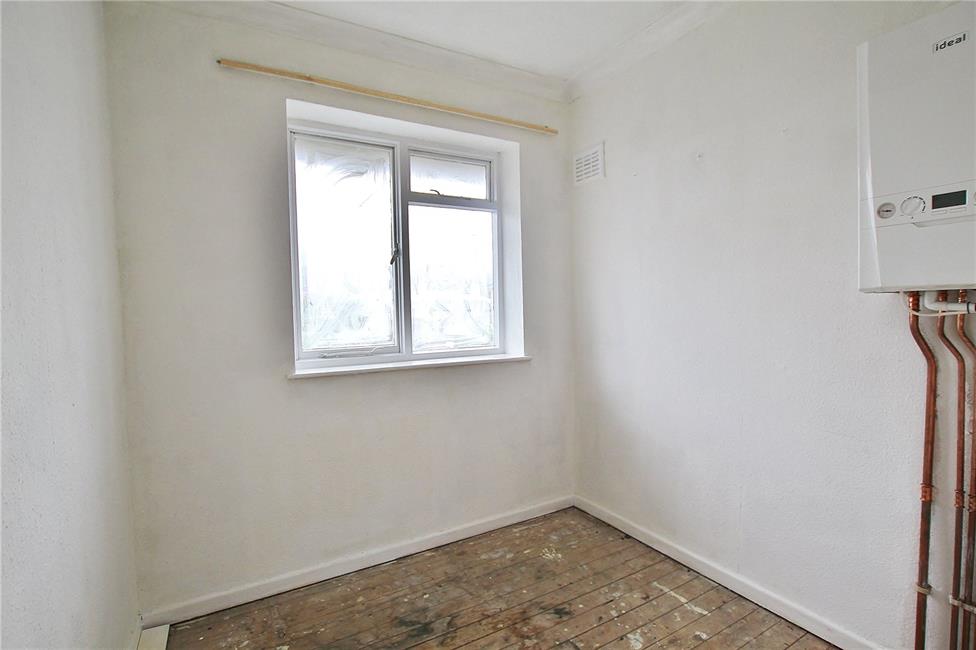 Overlooking the rear garden, basic base units and eye level units with inset sink, plumbing and space for washing machine, space for a cooker, space for fridge, cushion flooring, UPVC double glazed door to the side giving access to the rear, shelved under stairs pantry.