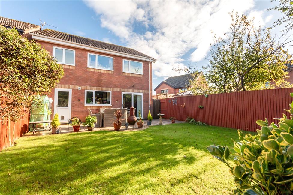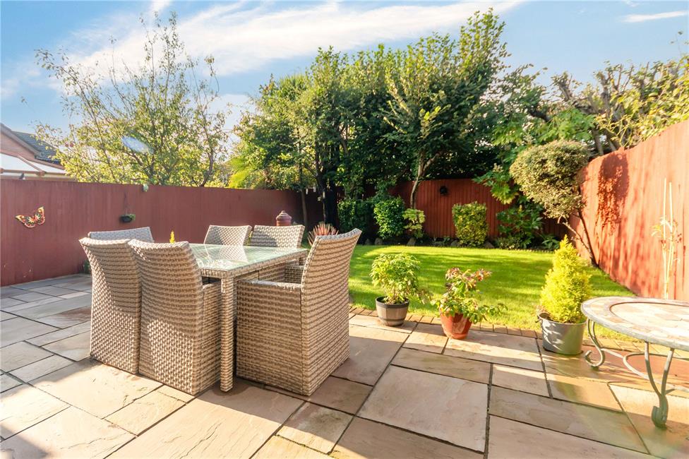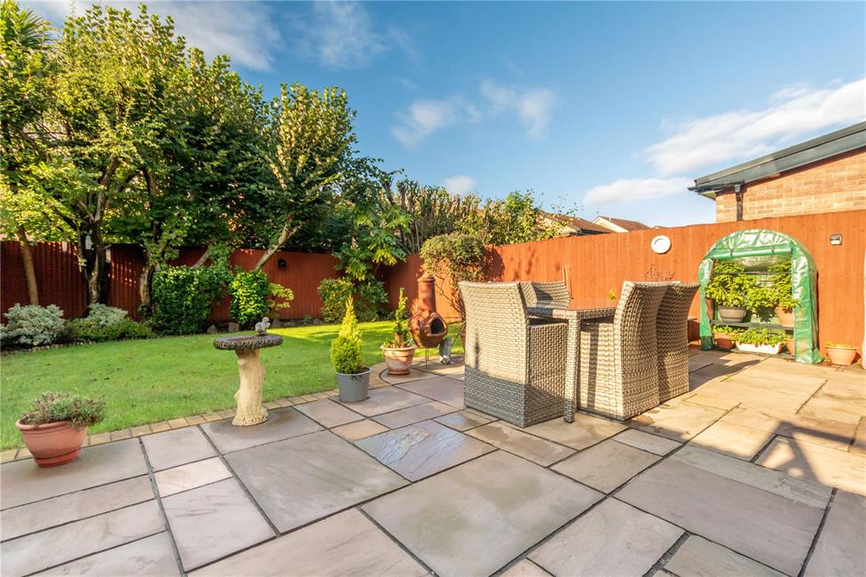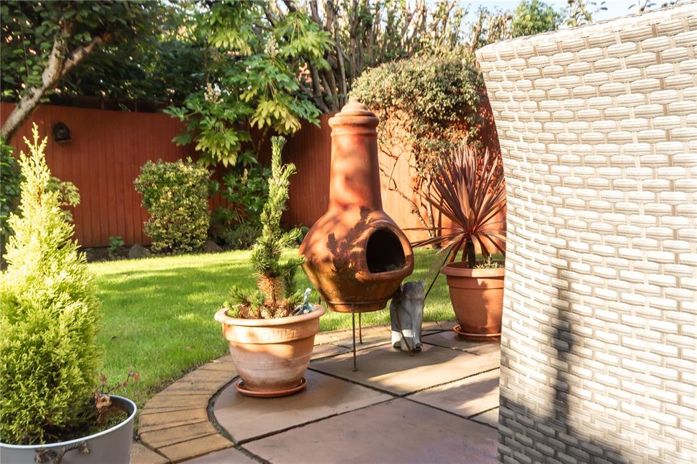 Beautifully manicured enclosed rear garden, flagstone patio area leading onto a flat section of lawn with flowerbeds to the rear with well stocked variety of trees and shrubs, enclosed with timber lapped fencing, outside solar lighting, outside cold water tap, timber gates to side with pathway leading to the front of the property.