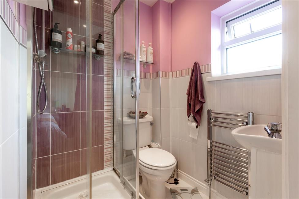 Comprising low level WC, twin grip bath with tiled surround and shower mixer tap, separate shower cubicle with Triton electric shower, pedestal wash hand basin with mixer tap, ceramic wall tiling to wet areas, radiator, tiled flooring.
