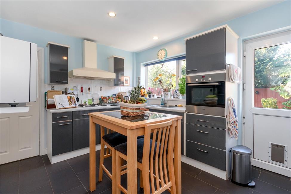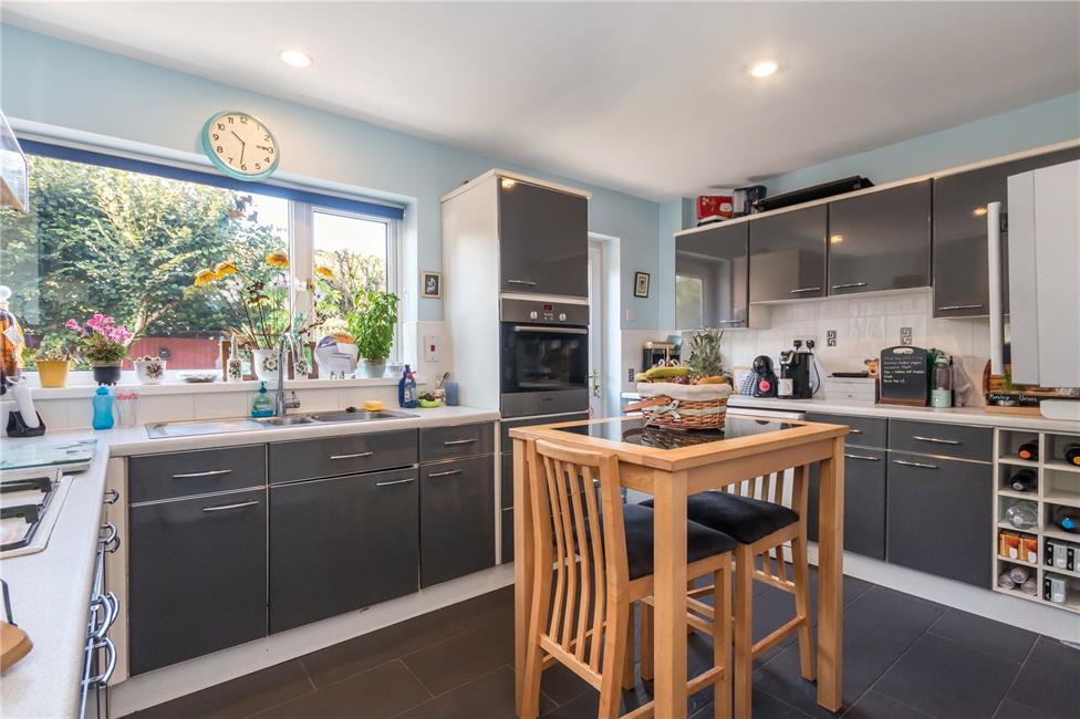 Appointed along three sides in gloss finish fronts beneath round nose worktops surfaces, inset one and a half bowl stainless steel sink and drainer with swan neck mixer tap, four ring gas hob with cooker hood, fitted Bosch oven, space and plumbing for automatic washing machine and dishwasher, space for upright fridge/freezer, matching range of eye level units, ceramic wall tiling to worktops surrounds, space for a breakfast table, radiator, inset spotlights, large window and uPVC glazed door onto the rear garden, door to integral garage.