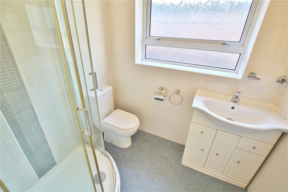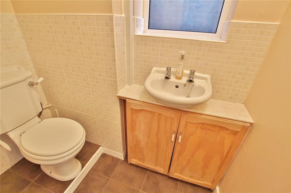 Comprising wash basin with cabinet below, low level WC, tiled floor. Window to side.
