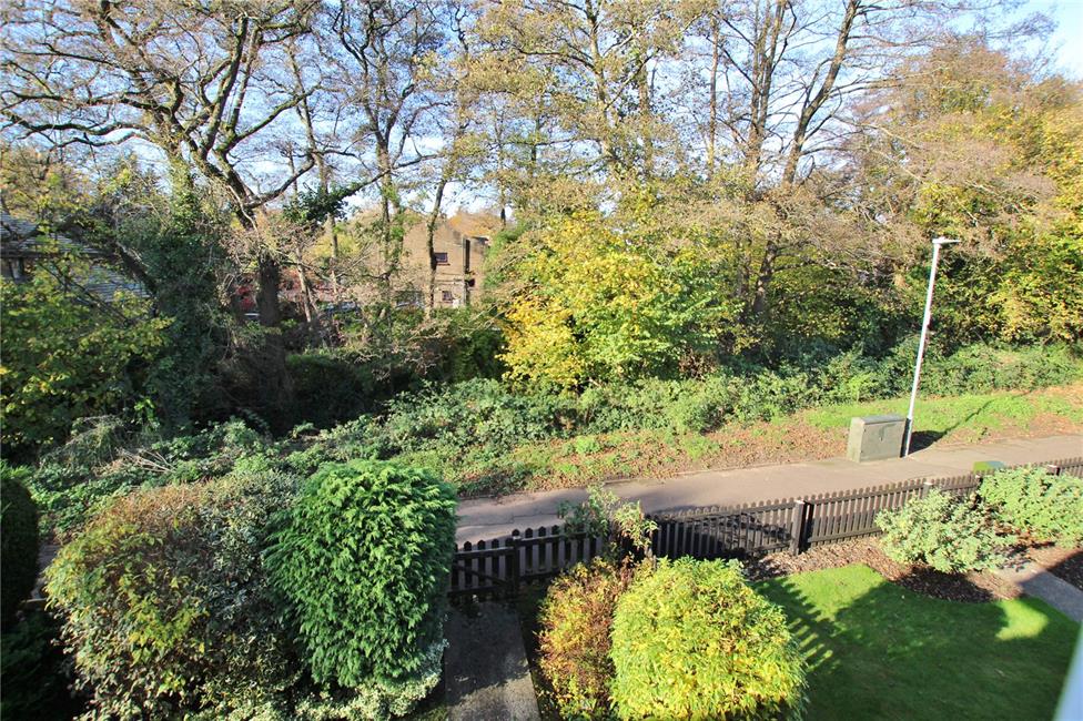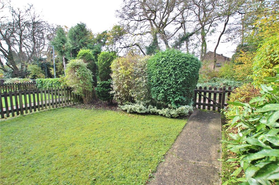 Laid to lawn with pathway to entrance hall, decorative timber fencing and shaped hedging to pavement line, overlooking the tree lined woods and meandering stream. Gate to side.