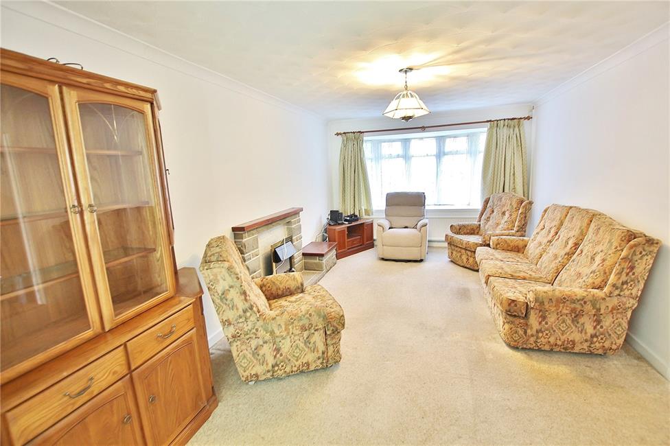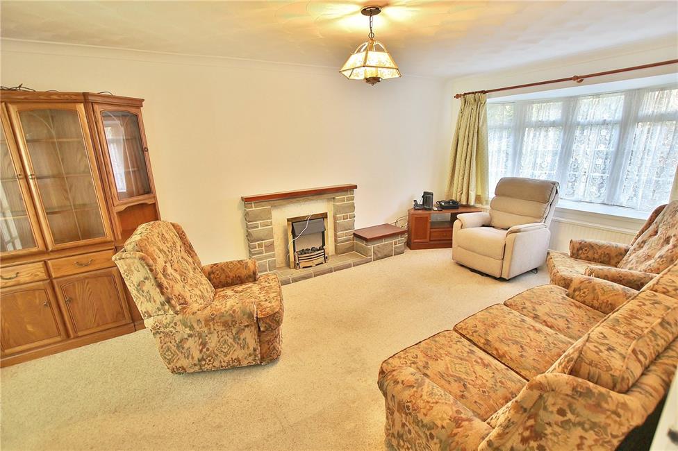 Feature bow window overlooking the front garden and woodlands to the fore, feature visual stone fire surround with wooden mantle and display side shelf, radiator, archway opening to dining room.