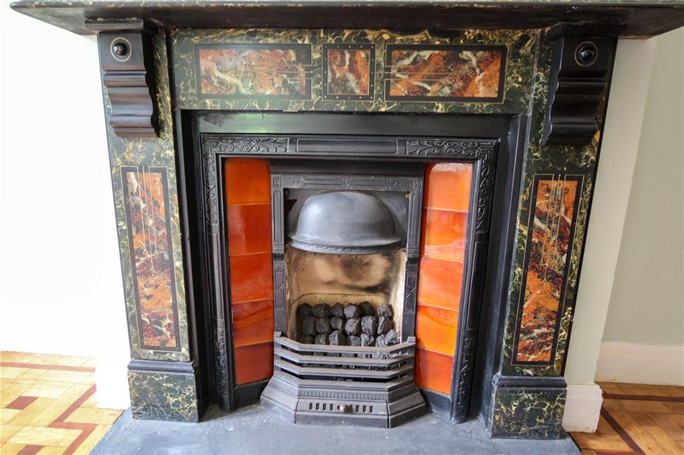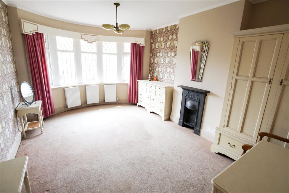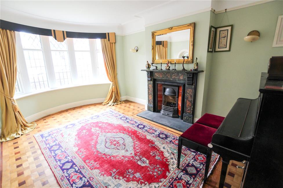 Overlooking the front garden and tree lined avenue, ornate fire surround with pillars, hearth and cast iron centre piece with tiled reveals, gas point, decorative woodblock flooring with border, feature circular coloured leaded light window to side.