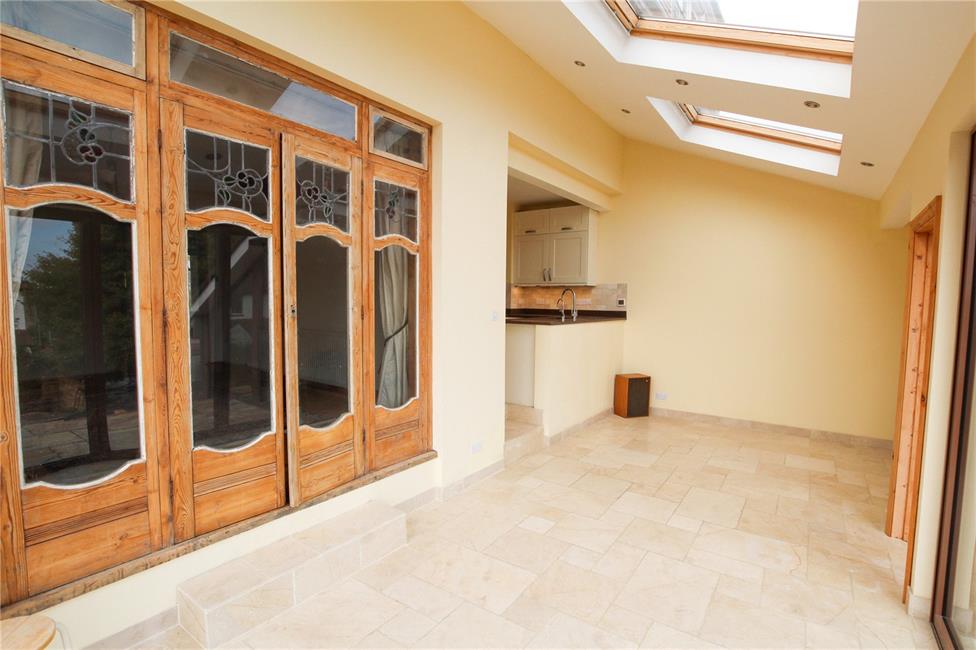 Well appointed along three sides beneath granite worktop surfaces with matching splashbacks, inset five ring gas hob with Zanussi circulating fan above, matching base and eye level cupboards with under pelmet lighting, integrated oven, integrated fridge with matching front, integrated freezer with matching front, integrated dishwasher with matching front, feature island inset with 1.5 bowl sink with mixer tap, opening to large dining area, marble tiled flooring, bi-folding doors leading onto the rear patio and garden, vaulted ceiling with Velux windows, ceiling spotlighting. Underfloor heating.