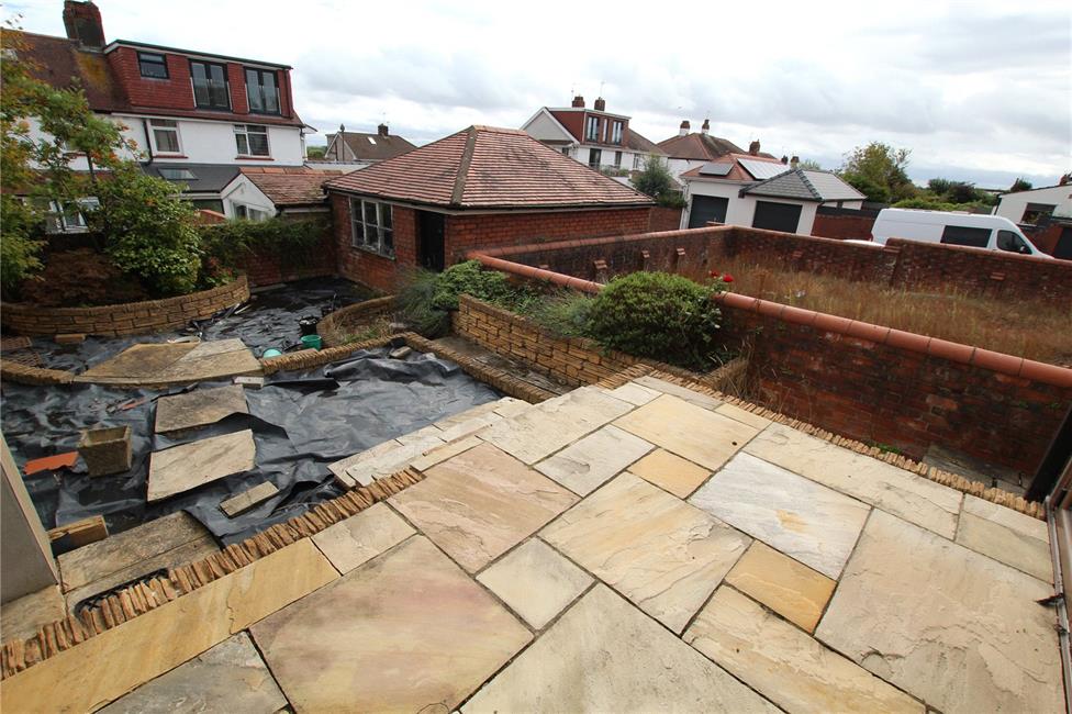 Ornate rear garden with sitting out areas, front garden with pillared two tone tiled driveway. Double garage with additional driveway from Earls Court Place.