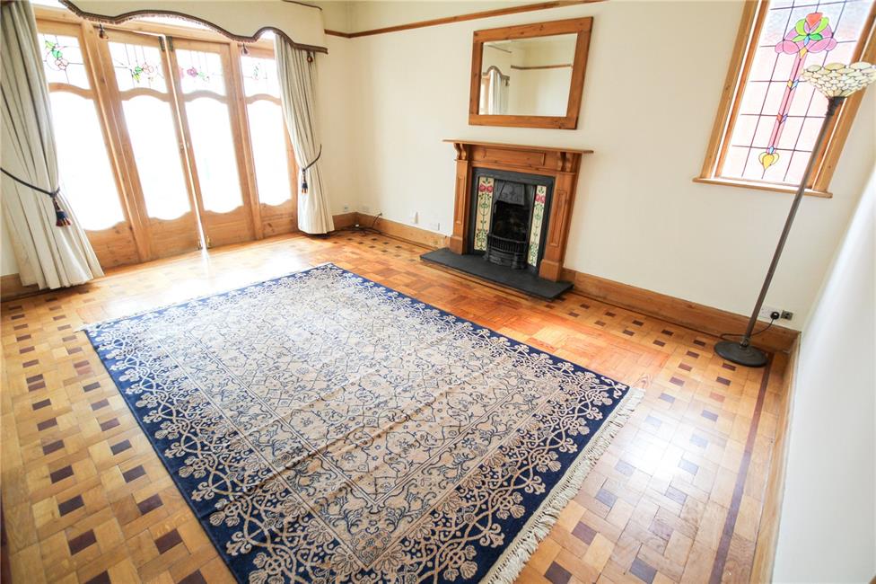 With twin veranda doors leading to the kitchen/ dining room, matching side panels with coloured leaded light windows above, decorative woodblock flooring with border, wooden fire surround with mantel, slate hearth, cast iron centre piece, gas point, ornate leaded light window to side, double panelled radiator.
