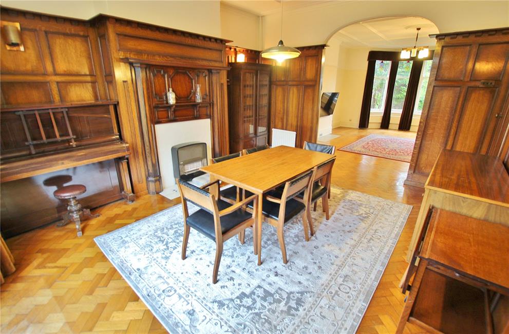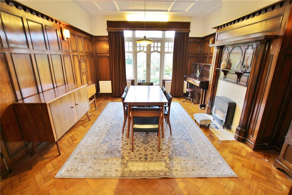 With feature oak panelling to four sides with matching oak inner leaf to door, French doors and large picture window overlooking the delightful rear garden, woodblock flooring, two radiators, serving hatch to kitchen, feature oak pillared fire surround with display mantels. Tall cornice ceilings with decorative ceiling borders.