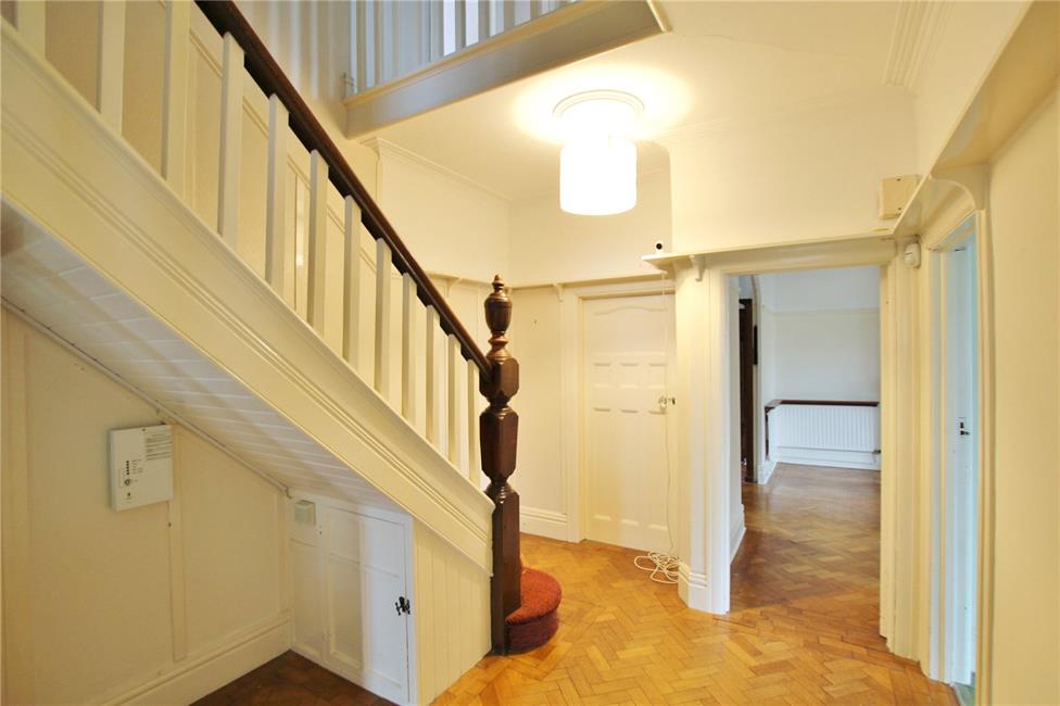 Approached by an attractive panelled front door with coloured leaded light windows to upper part, matching side panels and fanlight, leading onto a large and imposing central hallway with single flight staircase to first floor level, visible galleried landing, useful storage cupboard under stairs recess, woodblock flooring, decorative wall panelling with wall plate rack.