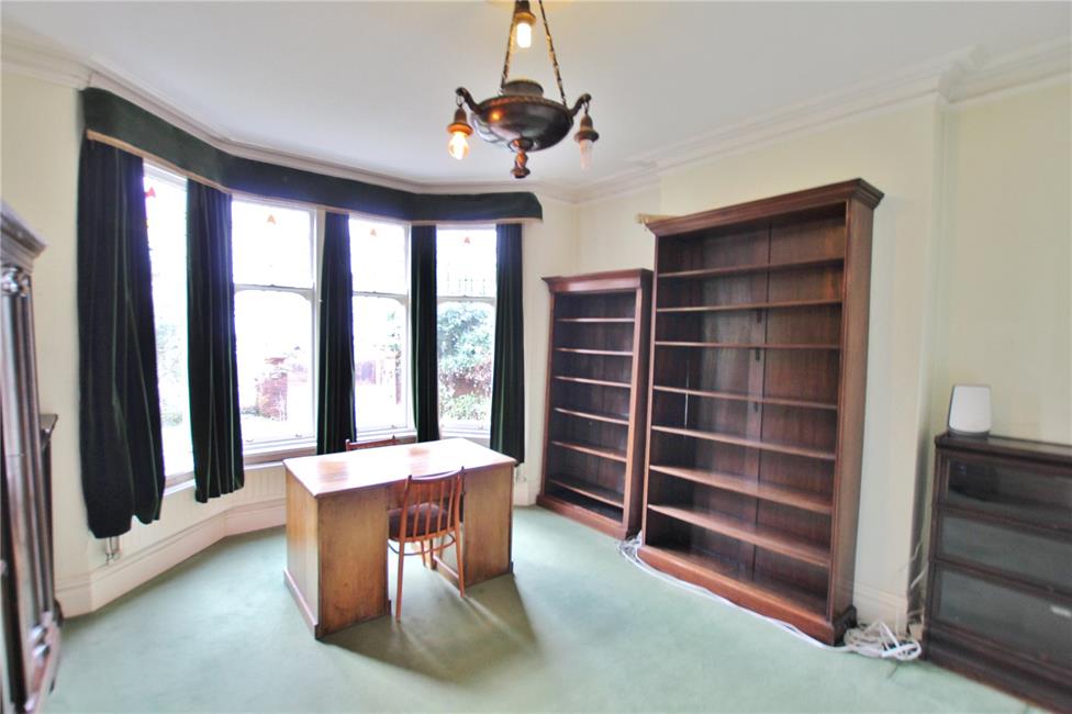 Overlooking the entrance approach, two radiators, tall corniced ceiling.