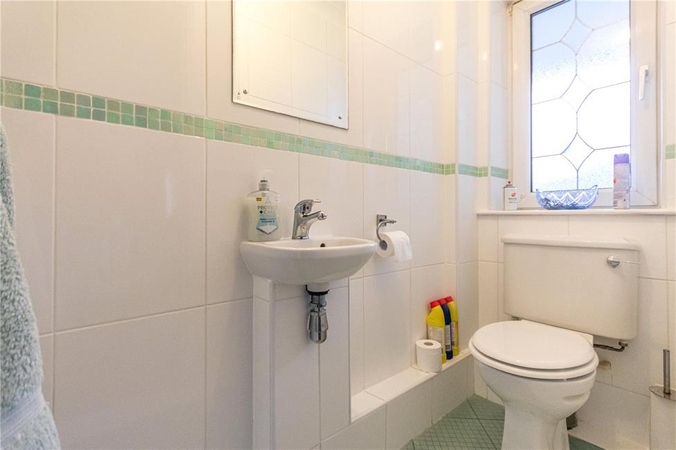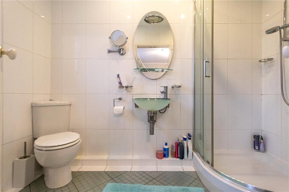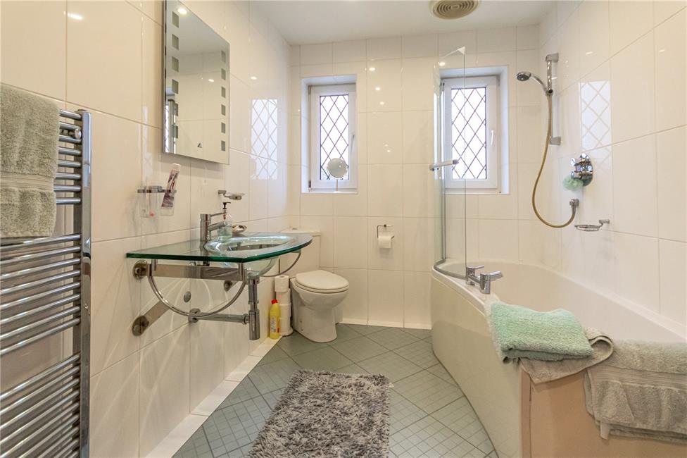 Comprising glass circular wash basin, corner low level WC, shower cubicle with glazed shower screen doors, quality wall tiling, chrome heated towel rail.