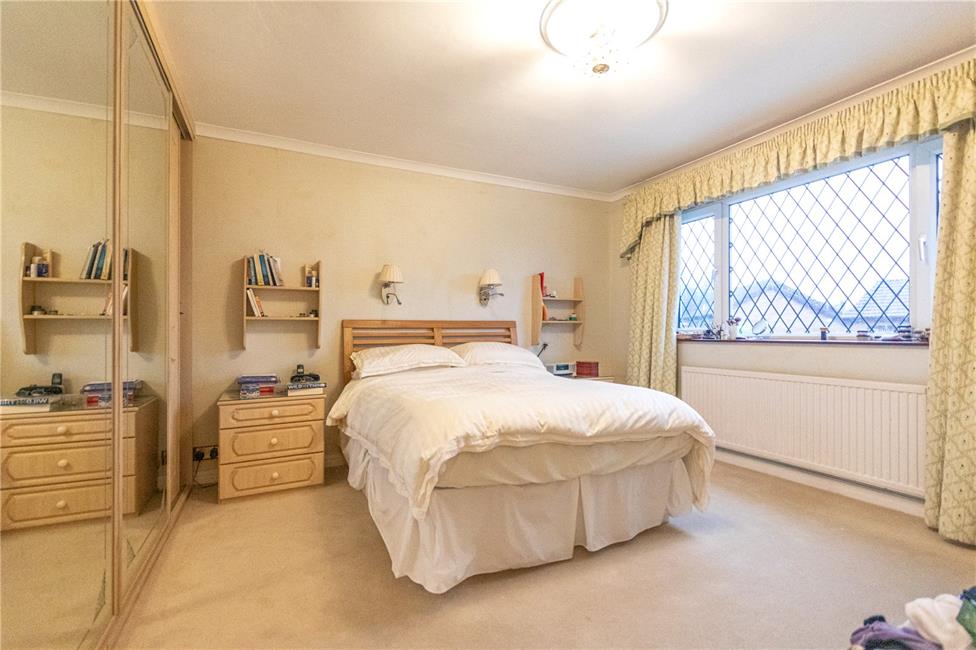 Overlooking the rear garden and enjoying wide views to the surrounding area, range of fitted wardrobes to one side with central mirrored panel, panelled radiator, access to loft.