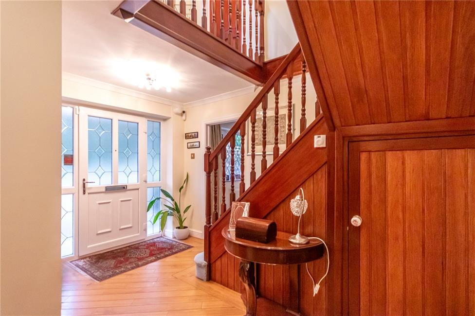 Approached by a uPVC panelled front door with decorative double glazed insert to upper part, matching side panels, leading onto a welcoming wide central hallway with full turning staircase to first floor level with visible galleried landing, deep storage cupboard under stairs recess, quality flooring, tubular radiator.
