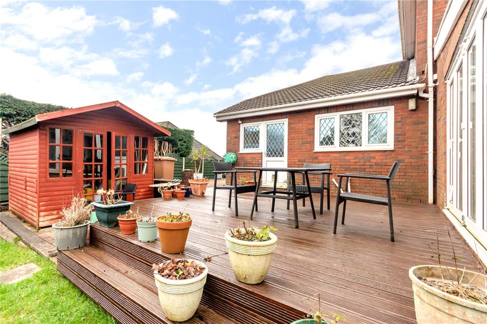 Wide timber deck relaxation area with steps leading to a wide area of lawn enclosed by timber lapped fencing. Timber chalet style summerhouse. Outside water tap.