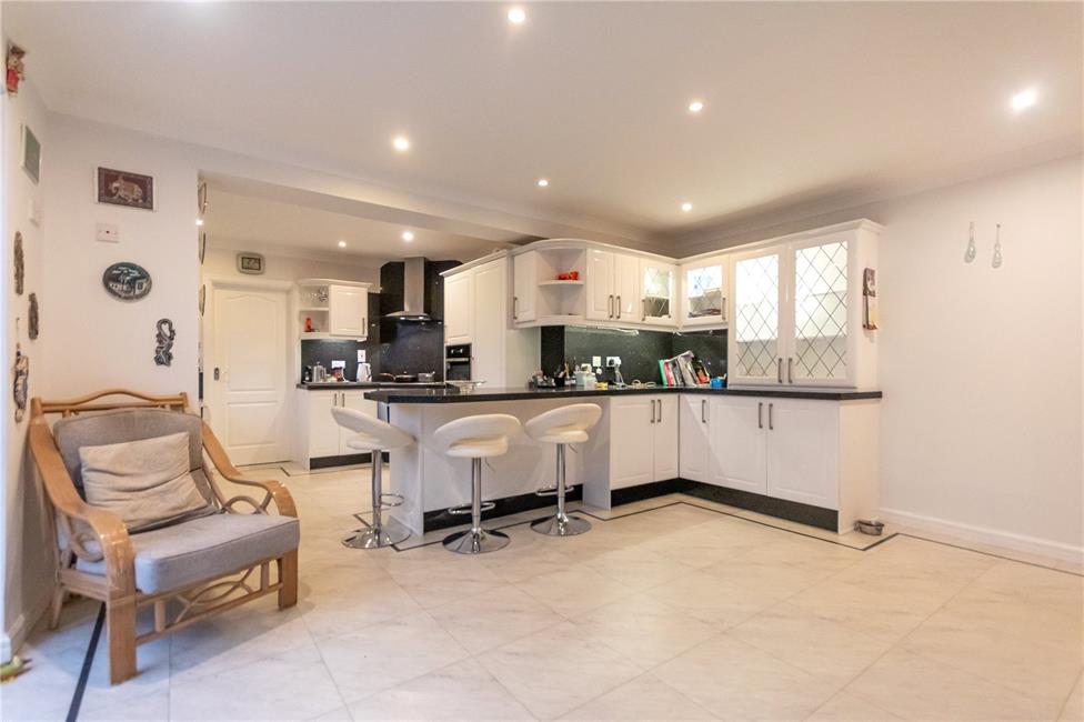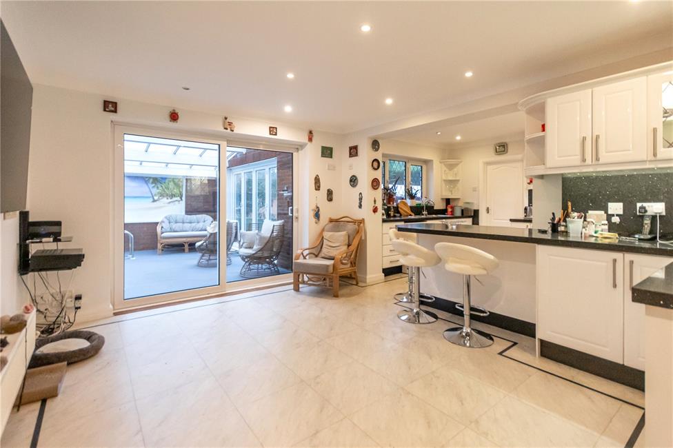 Of excellent proportions with quartz finish worktop surfaces, matching range of base and eye level wall cupboards with pelmets and borders, concealed pelmet lighting, inset four ring Hotpoint ceramic hob with circulating fan above, oven below, tall integrated fridge with matching front, inset stainless steel twin bowls with drainer, mixer tap and waste disposal, pleasing aspect to the rear patio and garden, feature peninsular breakfasting bar with additional range of base and eye level display cupboards with lighting, quality flooring with border, radiator, double glazed sliding patio doors leading to the pool room.