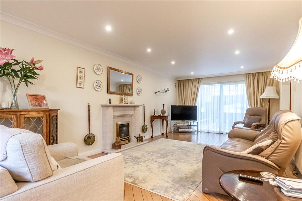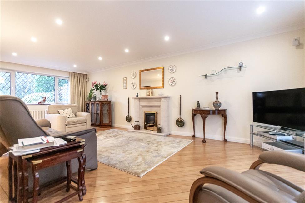 Of generous proportions with large picture window overlooking the entrance approach and surrounding tree lined area, feature contemporary style stone fire surround with matching hearth and mantel, living flame coal effect gas fire, quality flooring with border, tubular radiator, double glazed sliding patio doors leading to the pool room area, wide archway opening to dining room.