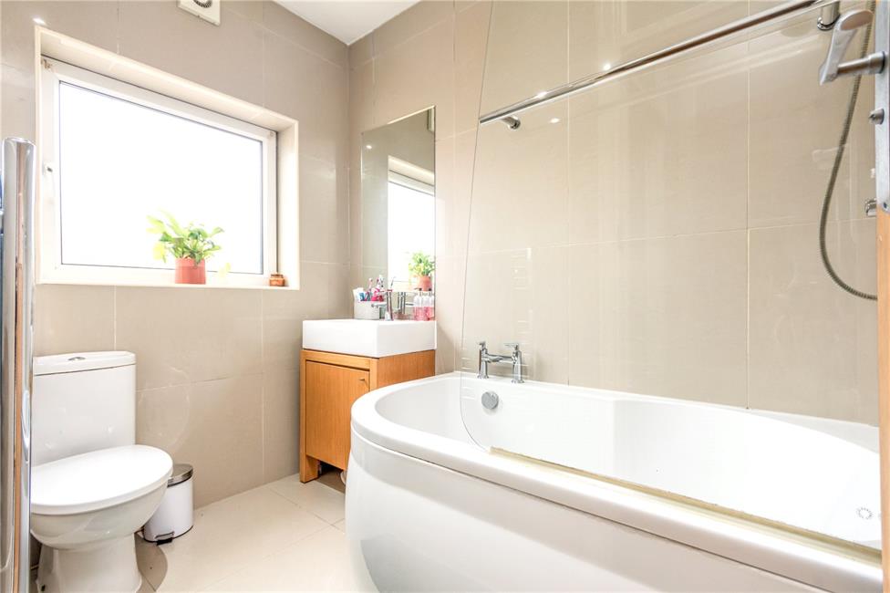 Stylish modern suite comprising low level WC, porcelain wash hand basin with cabinet below, panelled bath with Grohe shower, glazed shower screen panel, heated towel rail.