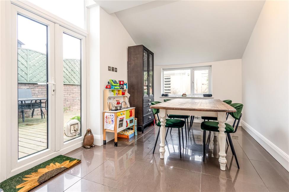 With double glazed French doors with matching floor to ceiling side screens overlooking the rear garden and timber decked patio, woodblock flooring, panelled radiator.