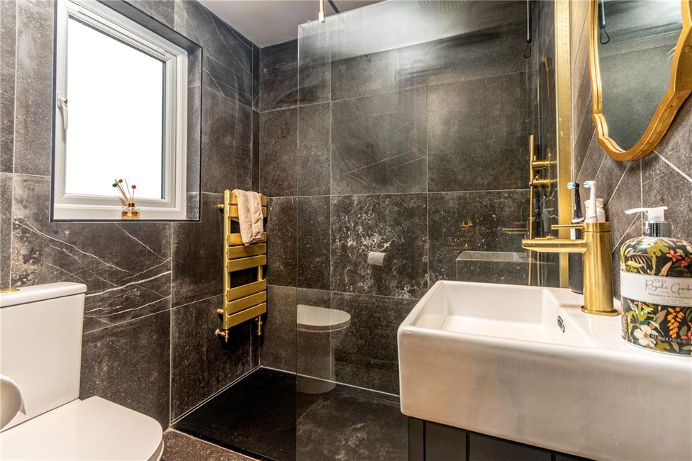 Stylish en suite comprising low level WC, treble width shower with shower head, glazed shower screen panel, bronze heated towel rail, vanity wash basin with cabinet below, quality floor and wall tiling.
