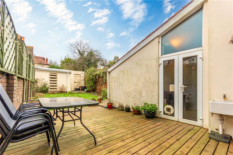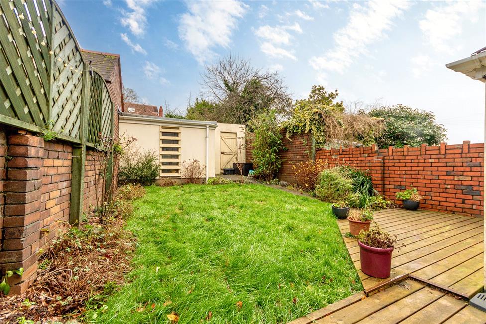 Wide timber deck patio relaxation area leading onto an area of lawn with paved pathway to far end, enclosed by brick walling, outside water tap with Belfast sink. Wide paved pathway with gate leading to the front garden. Large brick built store with power. Brace and battened door to rear service lane.