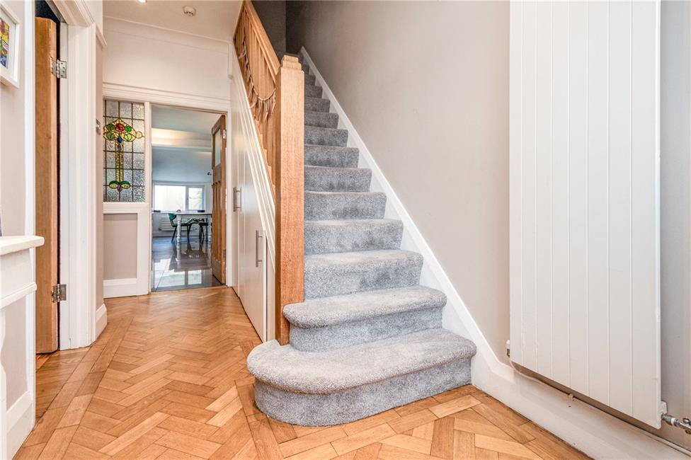 Approached by a composite secure entrance door with decorative coloured leaded light double glazed windows to upper part, matching side panels with fanlights, leading onto a wide and welcoming central hallway with single flight staircase to first floor with oak newel post and banister, woodblock flooring, stylish vertical wall radiator, range of deep storage cupboards to under stairs recess.