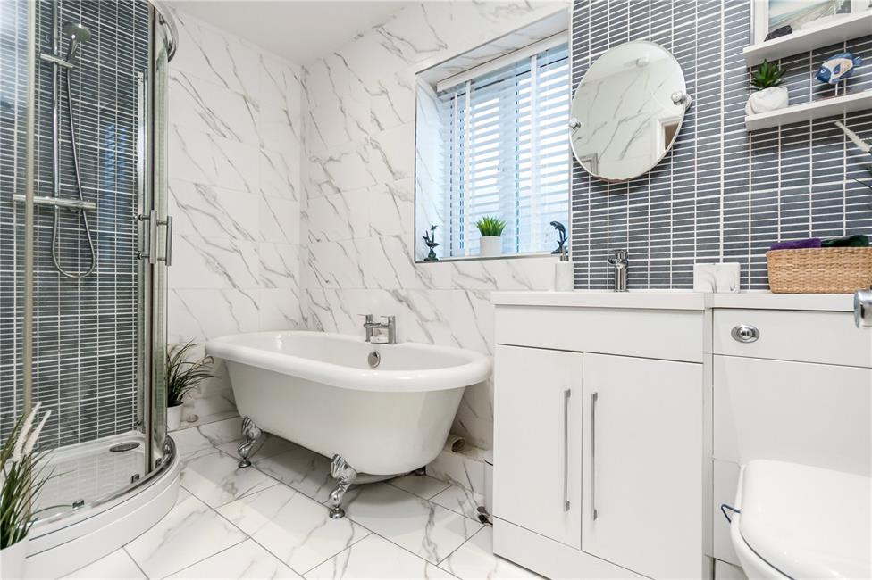 A beautifully appointed modern white suite with a feature roll top free standing bath with stylish mixer taps, a coupled low level WC with push button flush and inset sink with storage below, separate large quadrant shower with rainfall style shower head, flexible handle and thermostatic controls, tiling behind the sink area, quality marble style ceramic floor tiling, heated chrome towel rail, ceiling spot lights.
