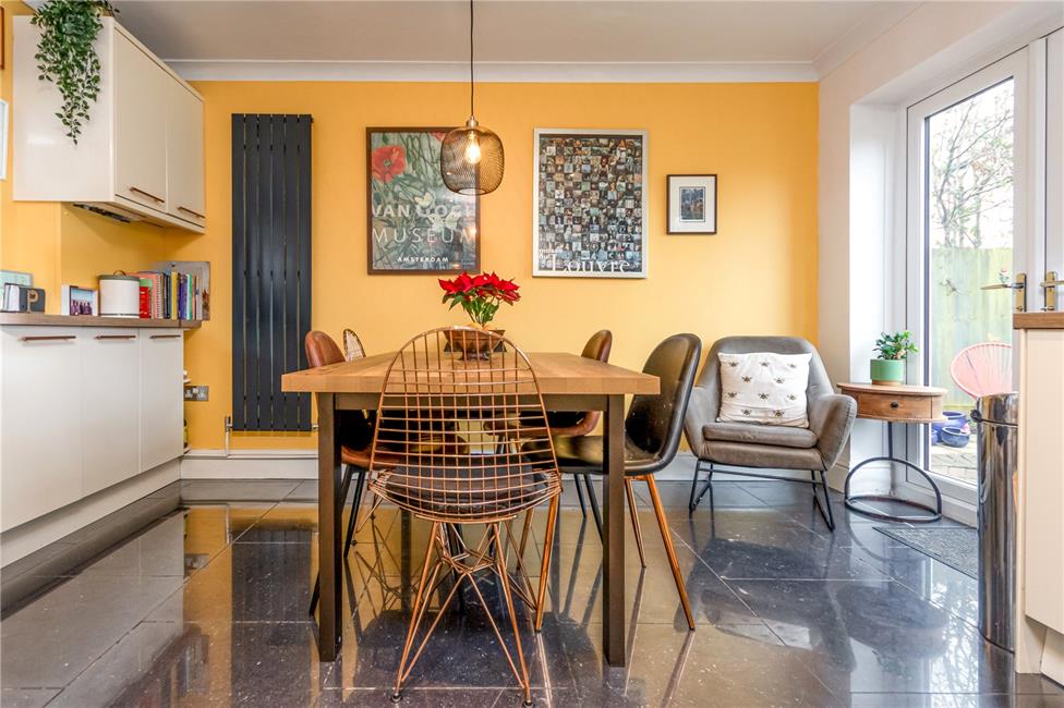Overlooking the large rear garden. A beautifully appointed modern gloss cream finish kitchen appointed along three sides with stylish copper style straight bar handles comprising of eye level units and base units with drawers, deep pan drawers and wood effect worktops over, quality wall tiling to work surfaces surrounds, inset sink with mixer tap, fitted four burner electric hob with oven below and cooker hood above, integrated dishwasher and separate washing machine, continuation of the quality floor tiling from the hallway, stylish tall radiator, ceiling spotlights, wall mounted gas central heating boiler concealed behind matching wall units, UPVC double glazed French doors opening onto the patio and 73' garden beyond