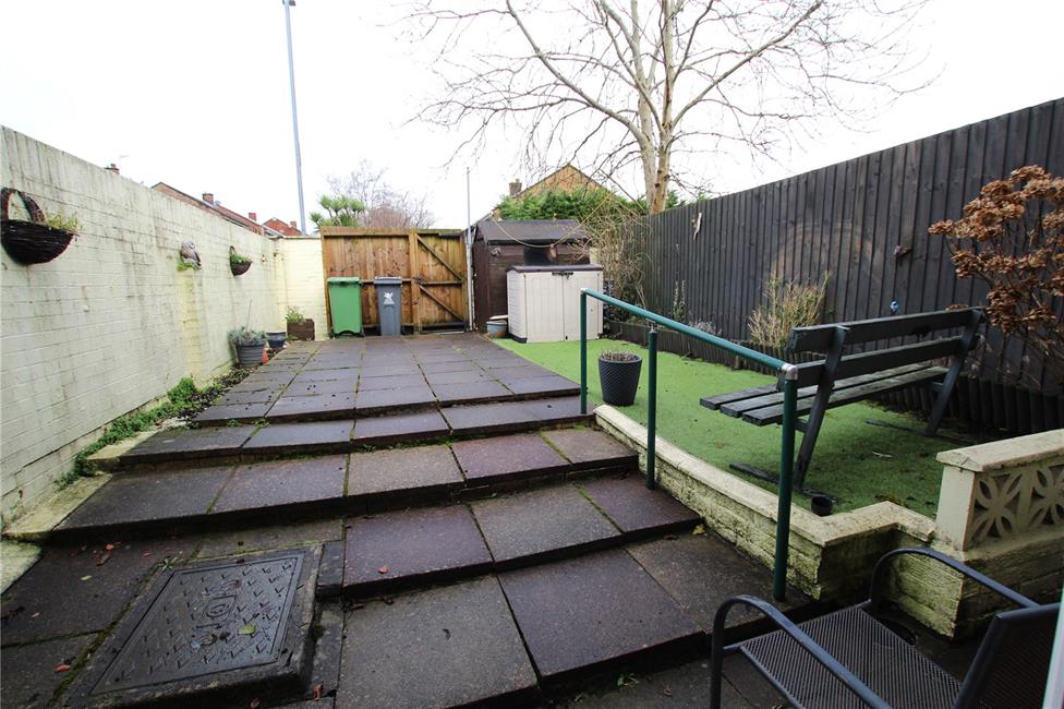 Laid mainly with paviour with an area of astro turf, covered rear porch, outside tap, gates to the rear giving access to parking area, timber garden shed.
