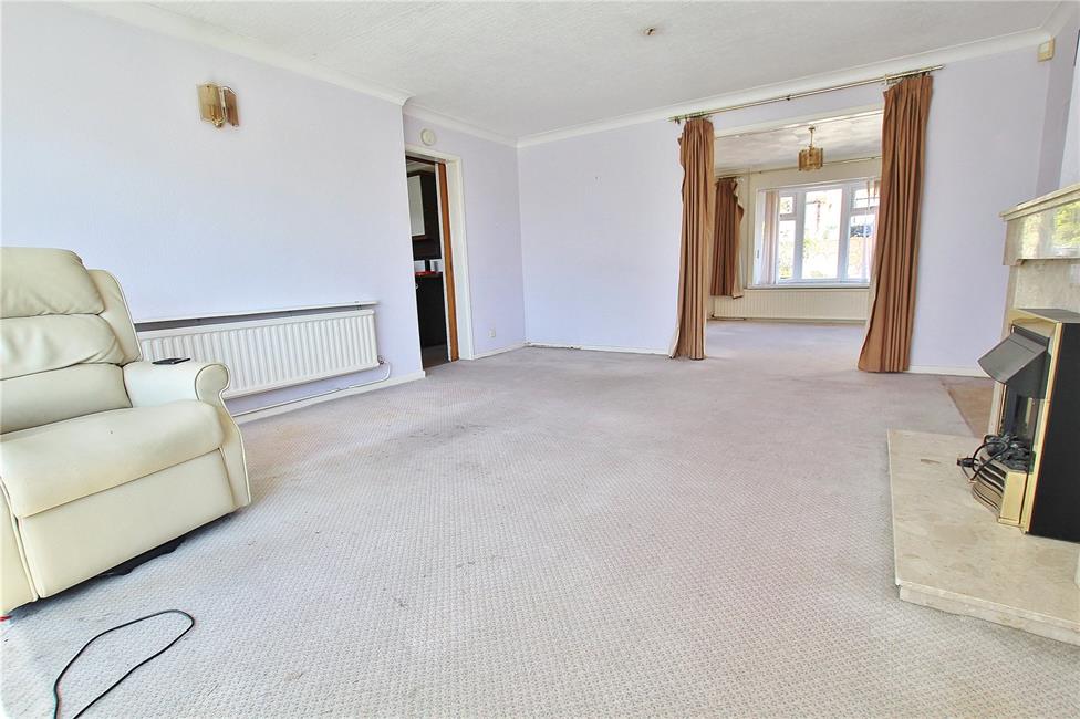 Extended from its original design with a large picture window overlooking the enclosed west facing rear garden, further window to the side, fireplace with a mock marble surround and coal effect plug-in electric fire, double radiator, double glazed door giving access to the rear veranda and garden beyond, square opening into the dining room.