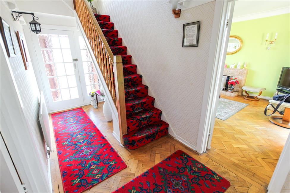 Approached by a small pane fully glazed door with matching side screen, leading onto a central hallway area with quarter turning staircase to first floor level with newel post and spindle banister, visible galleried landing, panelled radiator, woodblock flooring, wall plate rack.