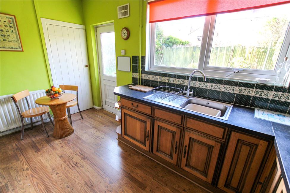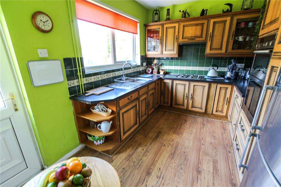 Range of base and eye level wall cupboards beneath lipped worktop surfaces, inset four ring gas hob with circulating fan above, matching range of base and eye level wall cupboards with pelmets and borders, integrated Neff grill and oven (missing handle), inset sink and drainer with mixer tap, ceramic wall tiling to worktop areas, pleasing aspect to the rear garden, space for bistro table, double panelled radiator, large walk-in pantry housing Worcester gas central heating boiler, plumbed for washing machine, double glazed door leading to the rear garden.