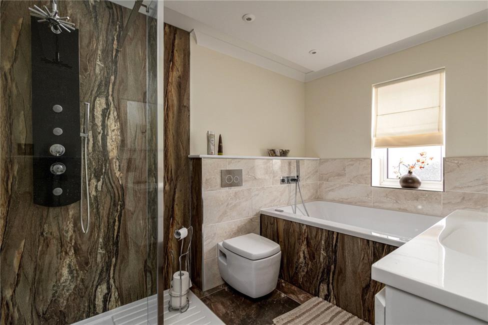 Stylish suite comprising large panelled bath, low level WC, walk-in shower cubicle with shower head and jets, glazed shower screen panels, splashback panelling, porcelain wash basin with cabinets below, ceramic wall tiling to half height, quality tiled flooring.
