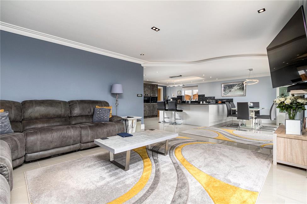 Truly magnificent having two sets of bi-folding doors leading onto the wide rear patio enjoying open views to the rear garden, countryside fields and coastline to the fore, quality bespoke fitted kitchen beneath quartz granite worktop surfaces, inset Bosch hob with Bosch induction fan, inset 1.5 bowl sink and drainer with Franke 1.5 bowl sink and drainer with mixer tap, integrated Bosch twin ovens with Bosch integrated microwave and warming tray, integrated dishwasher with matching front, wealth of base and eye level storage cupboards, feature breakfasting bar with overhead lighting, opening to family area, ample space for dining table.