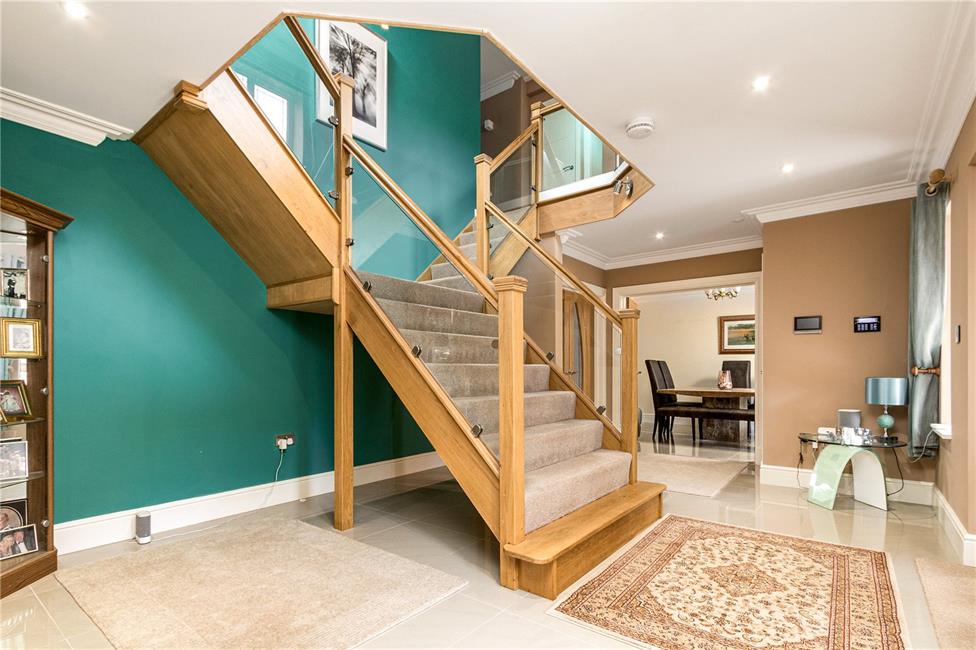 Approached via twin composite doors with decorative double glazed design inserts, leading onto an imposing grand reception hall with central staircase, oak newel posts and banister with glass panelling, visible galleried landing, porcelain tiled flooring, coved ceiling, built-in store cupboard.
