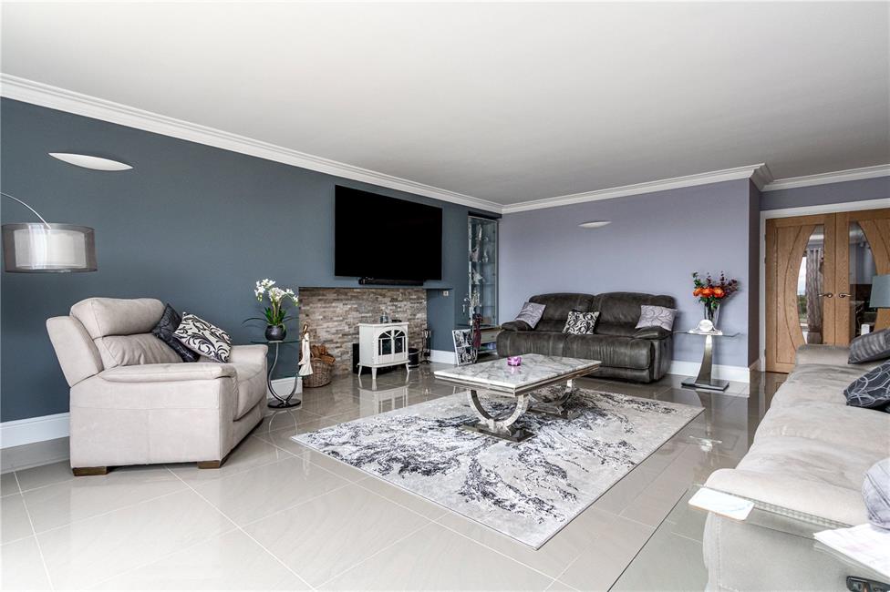 With bi-folding doors leading onto the wide and delightful patio relaxation area enjoying open views to the rear with country fields and Somerset coastline to the fore, feature fireplace recess, quality porcelain tiled flooring, coved corniced ceiling. Twin oak doors with shaped glass inserts returning to hall.