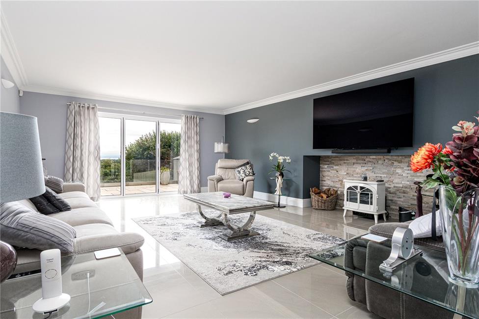 With French door leading onto the rear balcony and enjoying views to the rear garden, country fields and coastline to the fore.