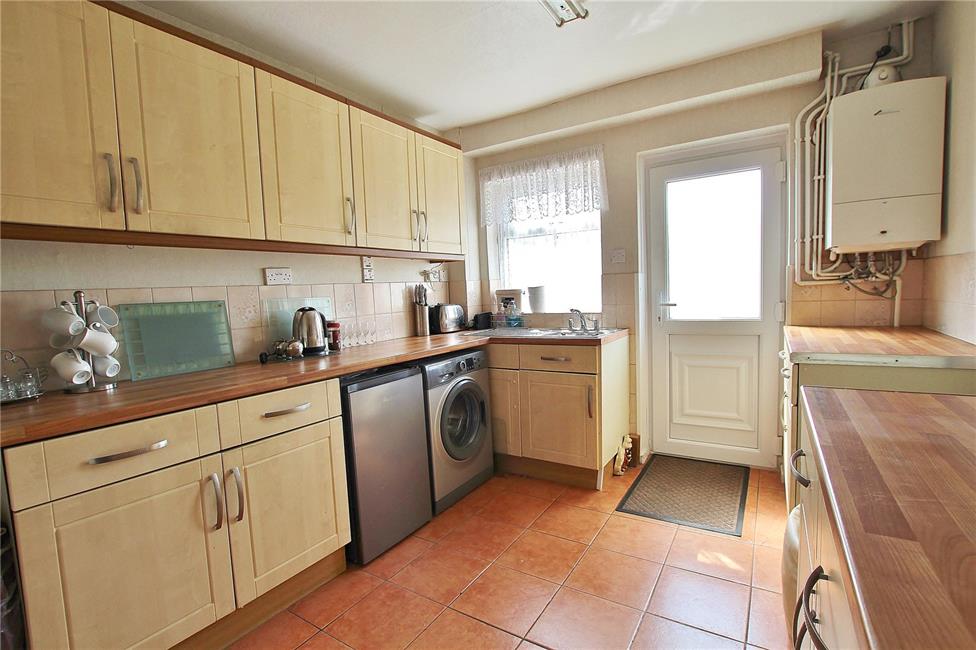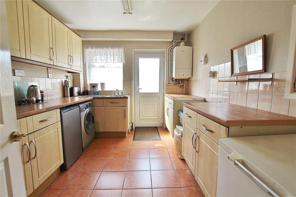 Overlooking the rear garden, a light maple style kitchen appointed along three sides comprising of eye level units and base units with drawers and wood effect round nose worktops over, ceramic wall tiling to work surface surrounds, inset sink with mixer tap and drainer, space for a cooker, plumbing and space for a washing machine, further space for an upright fridge freezer, slot for a tumble dryer, wall mount gas central heating boiler, ceramic floor tiling, serving hatch to the dining room, UPVC double glazed door giving access to the rear garden.