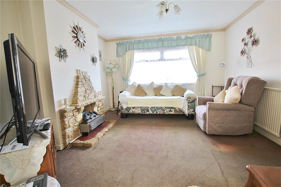 Large picture window overlooking the front garden, radiator, mock stone fireplace with a tiled hearth.