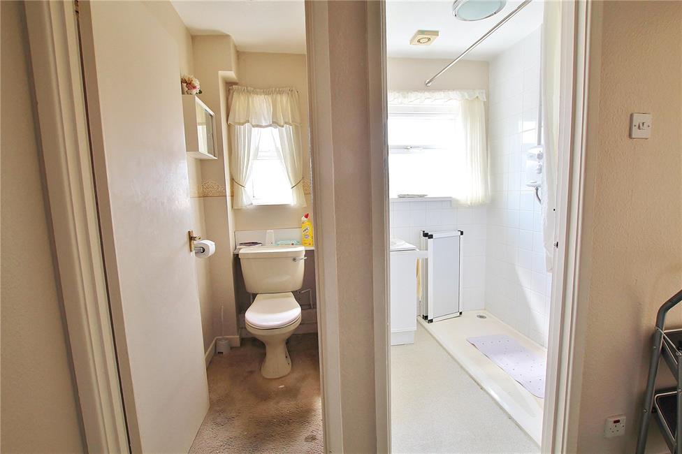 Opaque window to the rear. An adapted walk-in shower unit with bi-fold low level screen, Triton electric shower over, ceramic wall tiling, and anti-slip floor, sunken wash hand basin with storage beneath.
