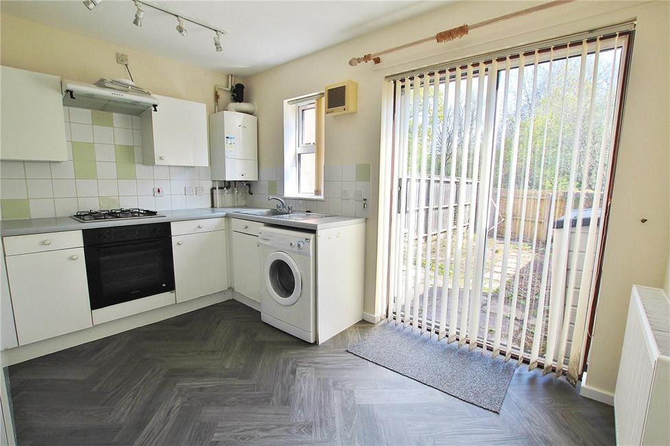 Window to the rear, white kitchen appointed along three sides comprising of eye level units and base units with drawers and round nose worktops over, inset sink with mixer tap and drainer, fitted four burner gas hob with oven below and cooker hood above, plumbing and space for washing machine, space for an upright fridge freezer, wall mount Worcester gas central heating boiler, newly laid wood effect grey cushion floor, double radiator, space for breakfast chairs, double glazed patio doors giving access to the rear garden.