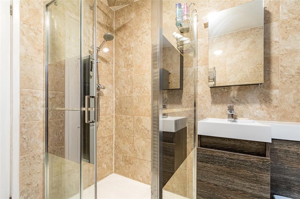 Opaque window to the rear, a large double shower with sliding glazed door, fixed rainfall style shower head above and flexible handle with thermostatic controls, comprehensive ceramic wall tiling, close coupled WC, pedestal wash hand basin, heated chrome towel rail, quality wood effect flooring.