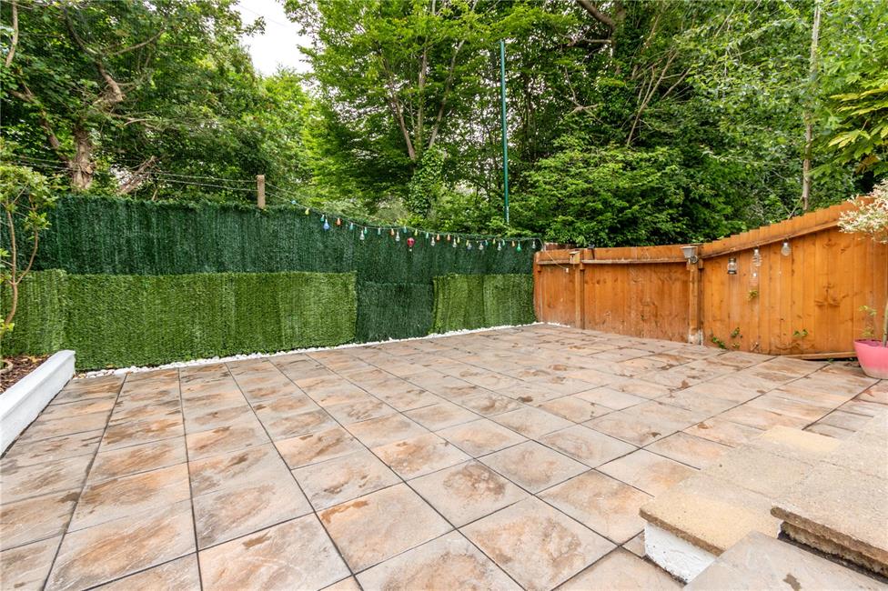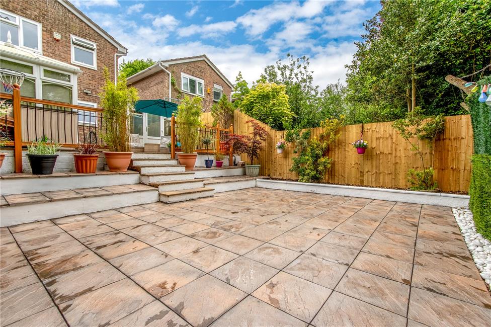 Completely re-shaped landscaped garden with an initial full width paved patio with decorative balustrade and steps leading to a lower patio which overlooks Cardiff Golf Course, fully paved with a small flower bed laid with bark chippings. Water tap. External lighting, new timber fencing