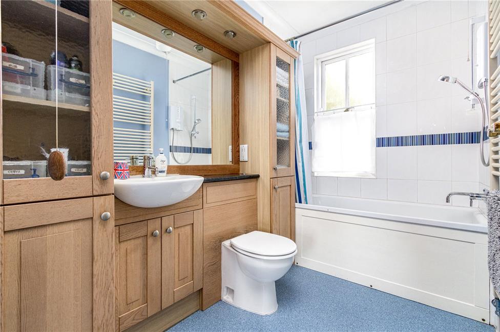 A modern white suite comprising of a panelled bath with wall mounted mixer tap with additional Mira electric shower over with ceramic wall tiling around the window to the rear, built-in unit with storage cupboards incorporating the half sunken wash hand basin with cupboards below and close coupled push button WC with concealed cistern, large vanity mirror with lighting and shaver point, cushioned flooring, heated towel rail, coved ceiling and high level skirting boards.