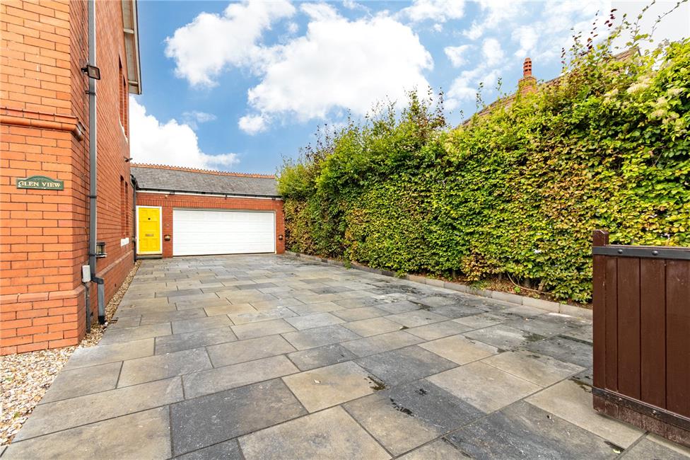 Enclosed with high level evergreen hedgerow, remote double gates leading onto the large driveway with quality laid paviour with parking for at least six cars leading to the double garage and second entrance door, lighting, pathway leads to the front garden and ornate covered porch with pitch tiled roof, pillared entrance and floor tiling, garden to the front is laid to lawn with a further area of raised flower beds and stone chippings.