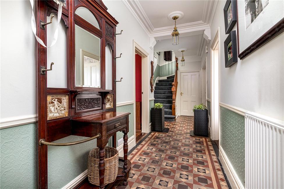 Approached via a bespoke hardwood entrance door with stain and leaded high level glazing with windows to each side, period floor tiling continuing through the hallway, radiator, coved ceiling, dado rail and skirting boards, stylish newel post with spindle full turning staircase to first floor landing, doors to the ground floor accommodation.