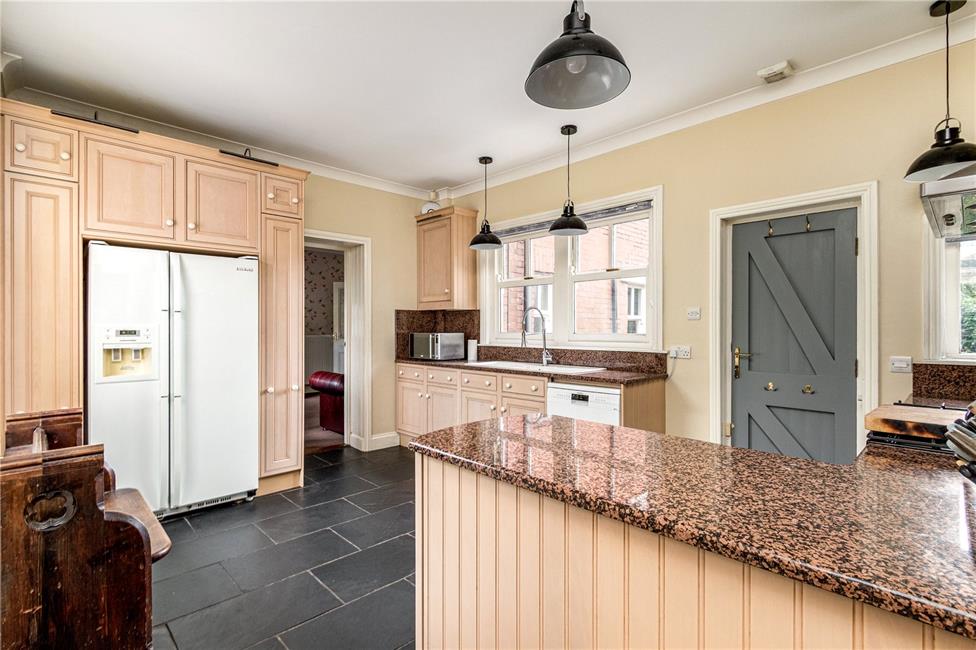 Dual aspect with sash window overlooking the driveway and further windows overlooking the rear patio, a fitted kitchen appointed along three sides comprising of eye level units and base units with granite work tops with matching upstands, fitted range style cooker with five burner gas hob, multiple ovens below with grill, stainless steel splash back and cooker hood above, V&B large double ceramic white sink with drainer and pull out hose mixer tap, plumbing and space for dishwasher, American fridge freezer, black slate floor tiling, radiator, door to the rear patio, further doors to the garage and utility room.