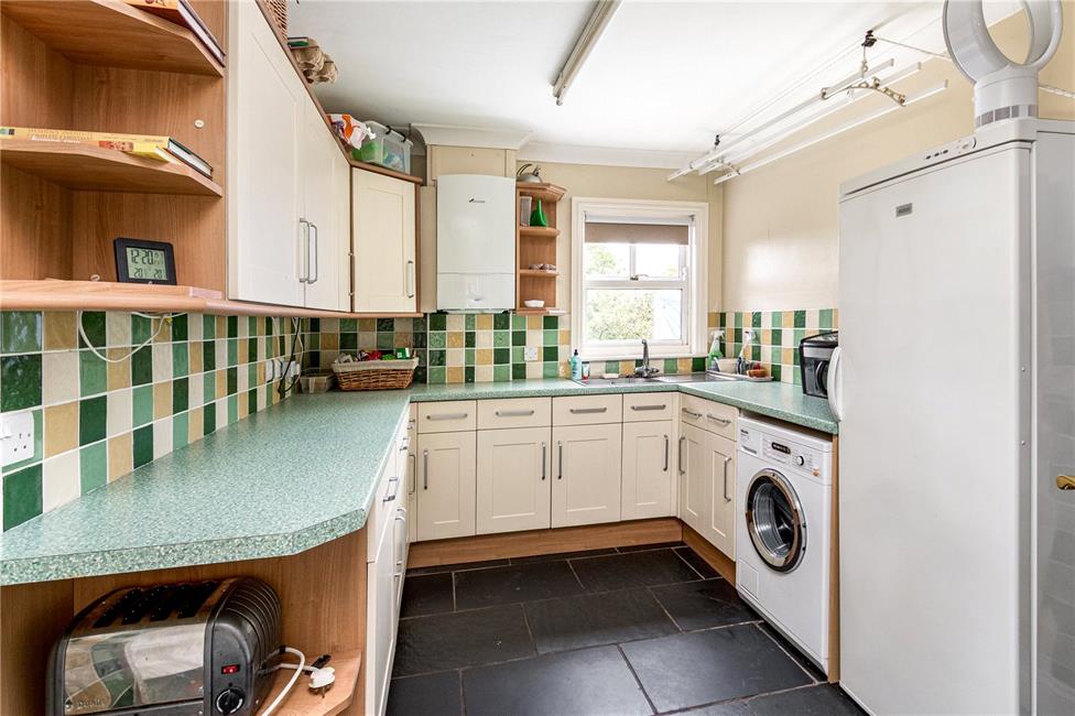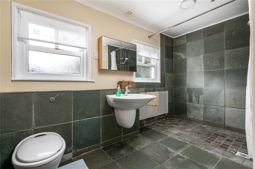 Overlooking the glorious rear garden, large utility room with cream units appointed along three sides comprising of eye level units and base units with drawers and round nose worktops over, ceramic wall tiling to work surfaces surrounds, inset extra deep sink with mixer tap and drainer, plumbing and space for washing machine, further space for a tumble drier or upright fridge freezer, radiator, continuation of the black slate floor tiling, wall mounted Worcester Bosch Greenstar condensing boiler, small loft access, door to the shower room.