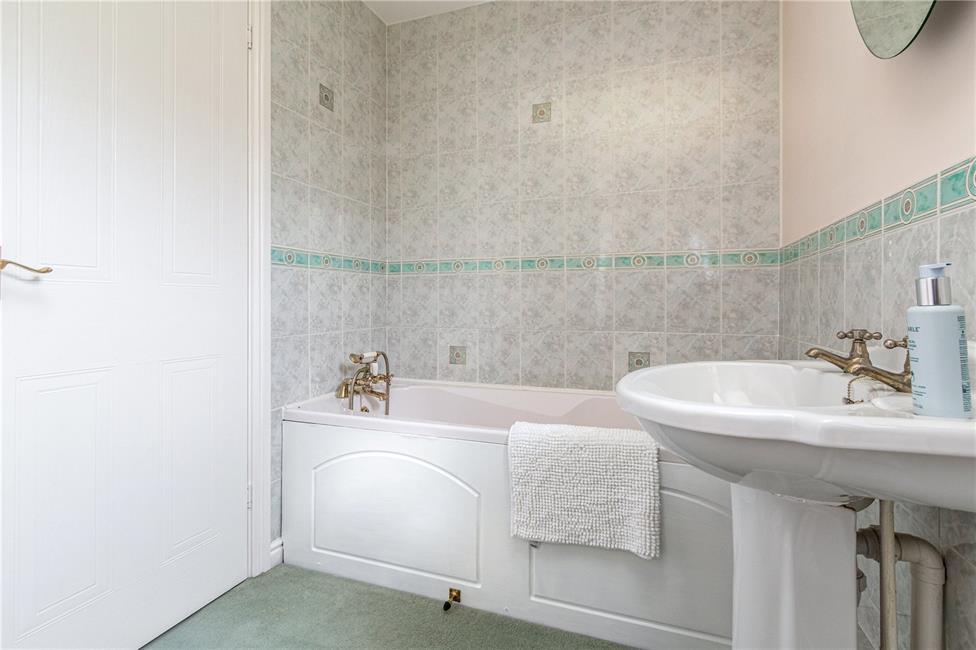 Opaque window to the rear, panelled bath with telephone style shower mixer tap, pedestal wash hand basin, close coupled WC, panelled radiator, shaver point.